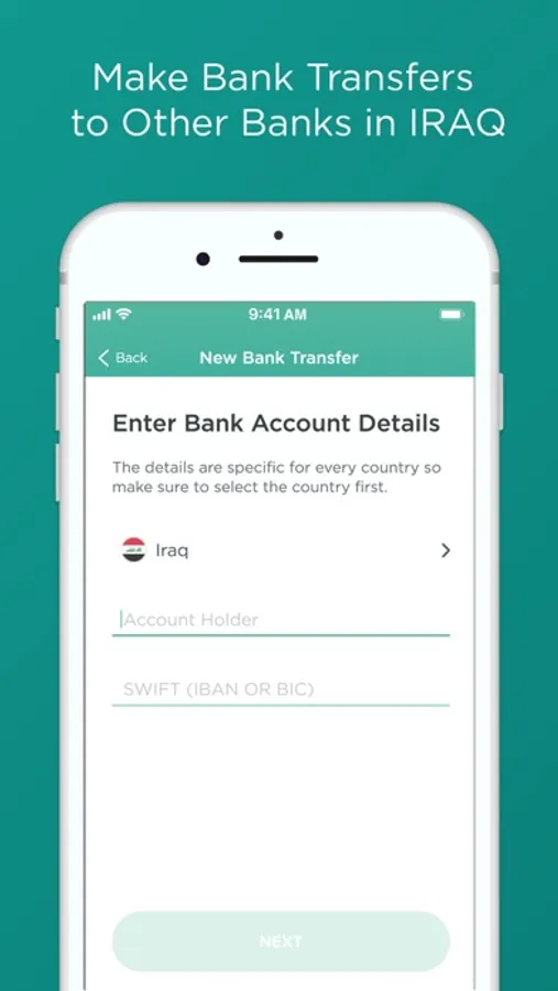 -Money transfers. Perform Peer-to-Peer money transfers to other First Iraq Bank account holders. They will get the money within seconds! First Iraqi Bank also allows you to make local and international transfers to other banks.