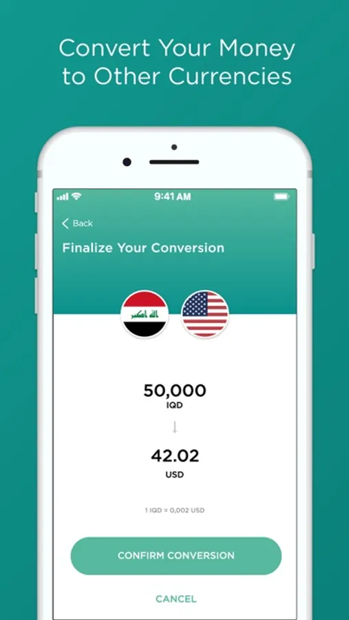 -Money conversion. Do you want to store and spend your money in different currencies? With First Iraqi Bank you can easily convert your money between IQD, USD, and EUR.
