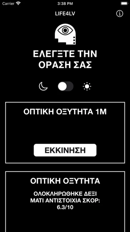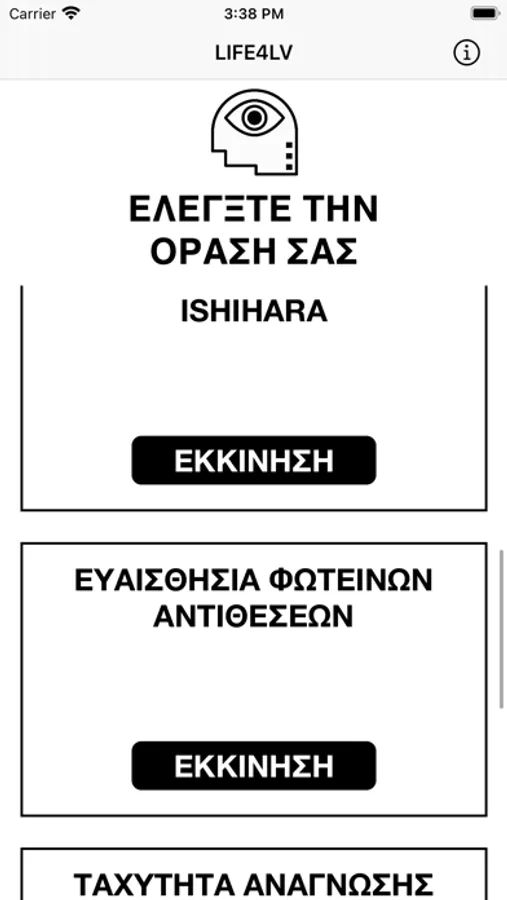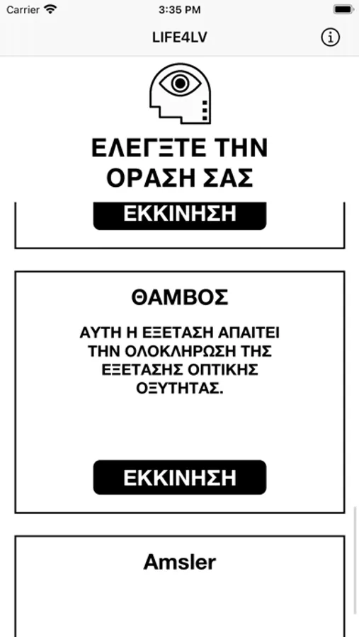 The LIFE4LV platform consists of a mobile application that implements individual examinations (tests) to evaluate specific parameters of the visual function and a back-end system for recording and monitoring/managing the results. The self-assessment tests currently involved are