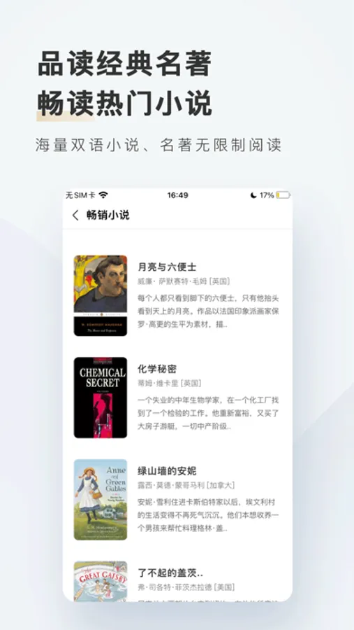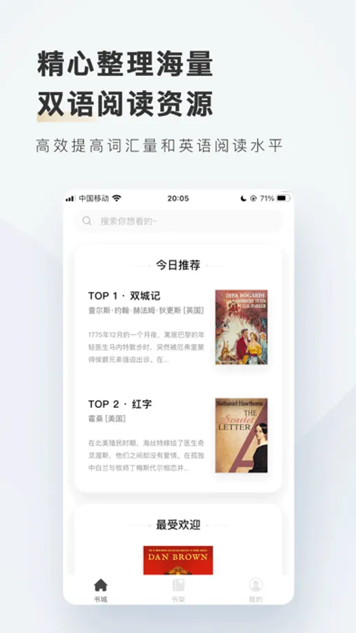 海量双语小说、世界名著无限制阅读;支持中英文对照切换, 让您感受学习英语所带来的乐趣。