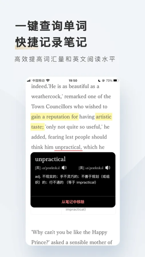 3. 便捷的查询单词与添加笔记功能, 快速标记单词, 助你快速提高词汇量与阅读水平;