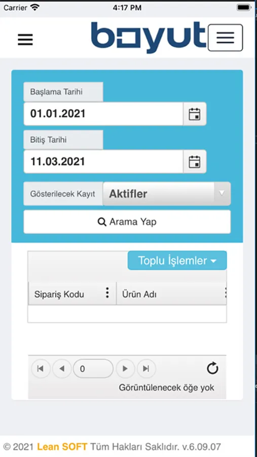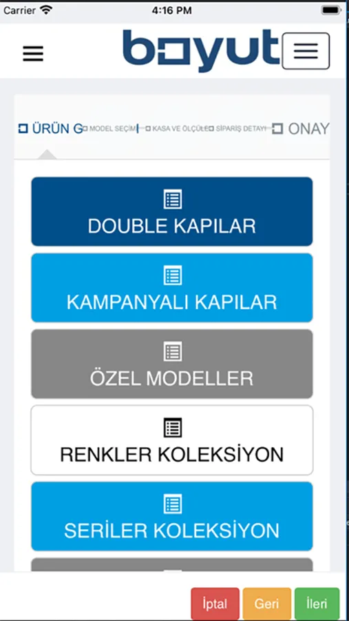 e-Bayi Boyut Çelik Kapı mobil uygulaması ile firma bünyesinde bulunan bayilerin başvuruda bulunup bayiliklerini açmalarını ve sipariş takibi, yeni sipariş işlemleri, sepet yönetimi, finans işlemleri gibi işlemlere her yerden erişebilmesini hedefleyen bir platformdur.