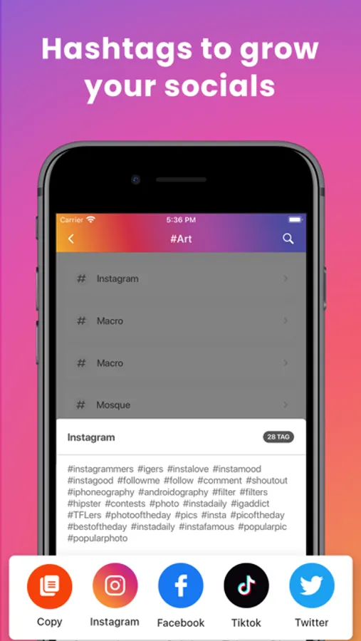 Do you need some inspiration or an instant set of hashtags for your post? Well, you found the right place. HashTag app is preloaded with the quickest way to find hashtags for your photos & posts. More power with searching tags. This tag generator app is the right tool for marketing and popularity. Choose your favorite topic and load hundreds of hashtags for it from our over 5000 tags collection.