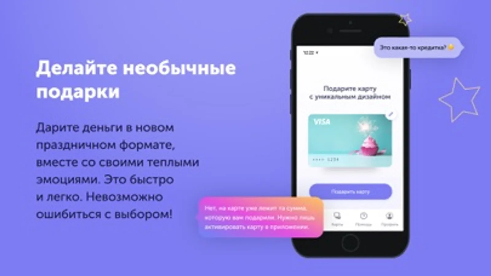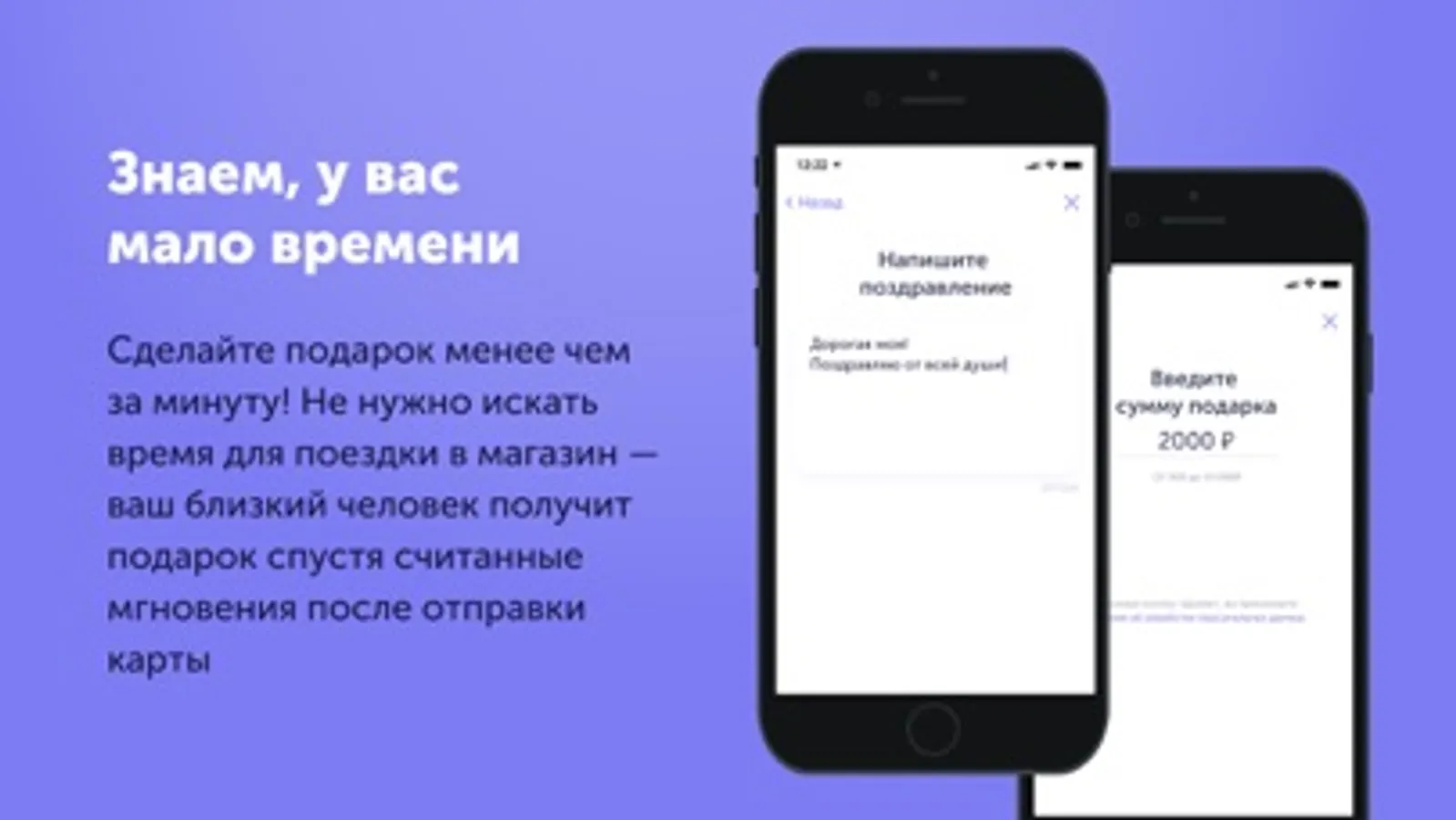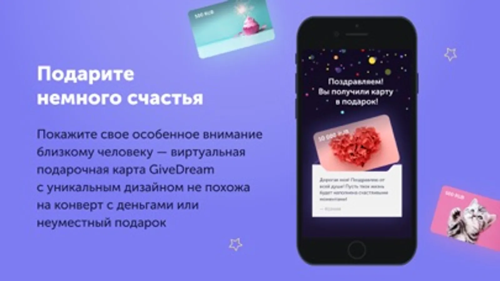 Выберите один из уникальных дизайнов, телефон получателя подарка, напишите поздравление, пополните карту и дарите своему близкому человеку.