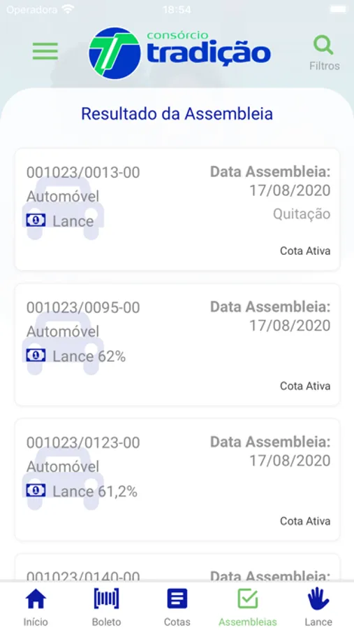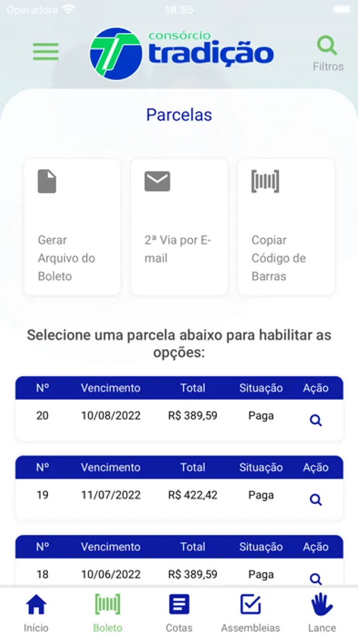 Com o TradCon você pode ofertar lances, emitir segunda via de boletos, verificar o resultado das assembleias e acompanhar sua cota.