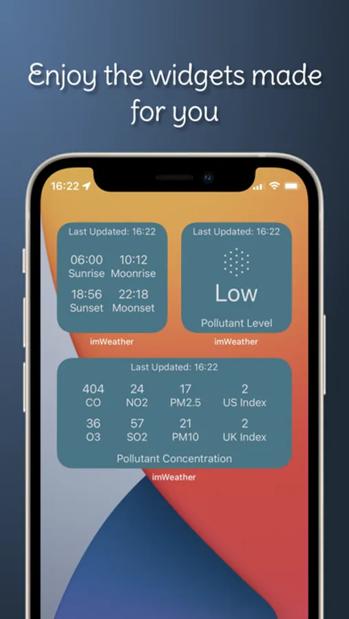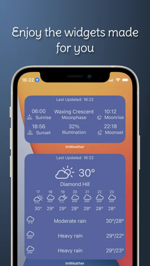 imWeather provide 4 categories, 9 widgets in total for you to choose from, place it on your Home Screen and be conscious of the weather around you, throughout your life. It is base on your current location. More widgets will be included in a later version.