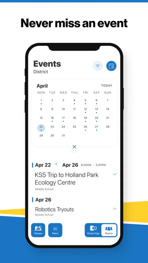The event section shows a list of events throughout the district. Users can add an event to your calendar to share the event with friends and family with one tap.