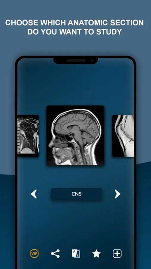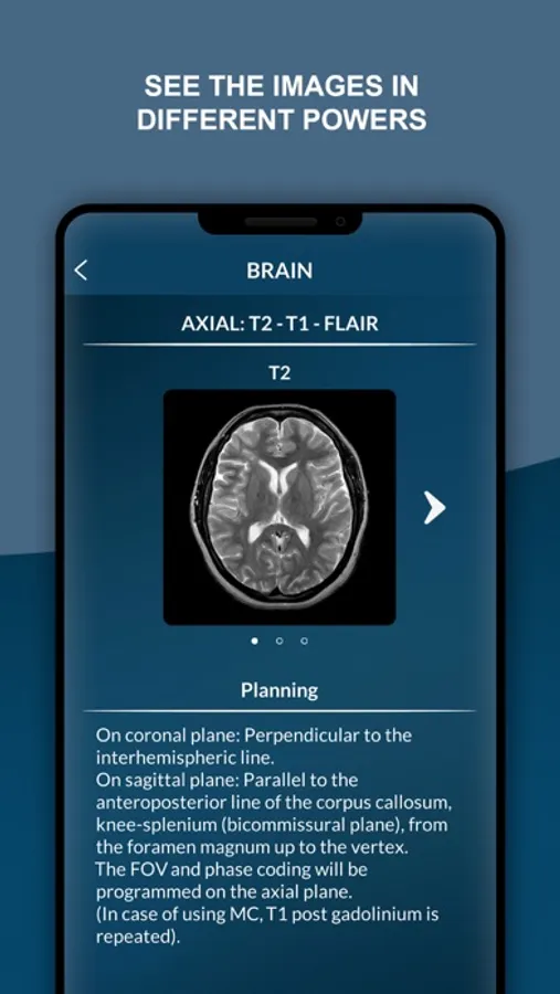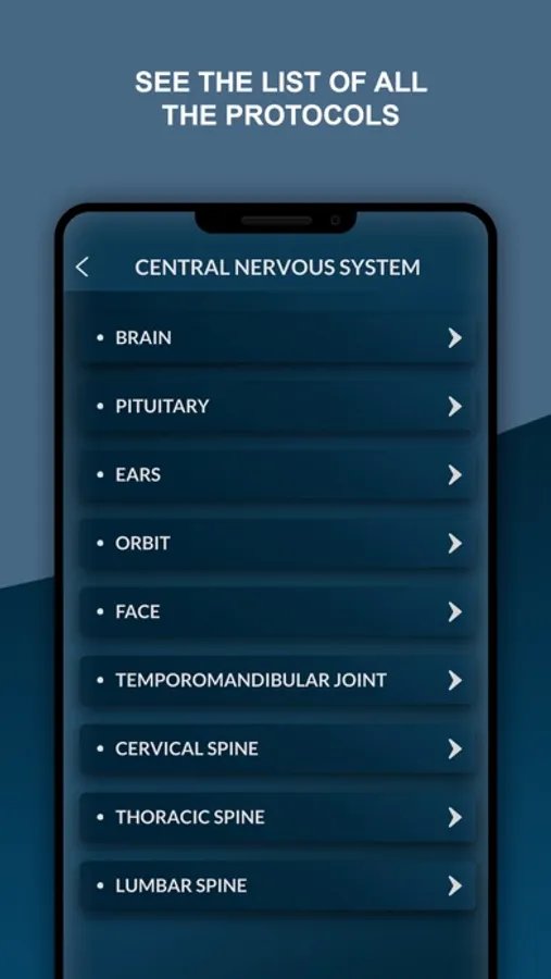 Within the app you will find the protocols divided by sections, Central Nervous System, Trunk and Osteoarticular.
