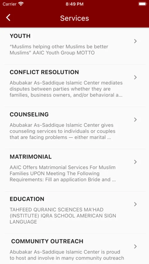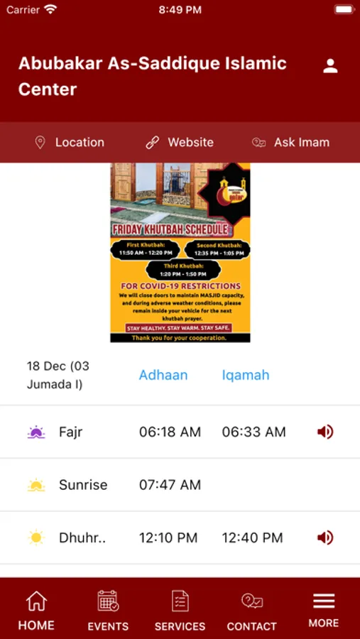 Abubakar As-Saddique Islamic Center provides prayer services for the 5 daily prayers and the Friday prayer. Abubakar As-Saddique Islamic Center serves its educational purpose as well, with its full time Weekend Islamic School, along with the Weekday Hifz and Nazra class. Abubakar As-Saddique Islamic Center also holds various halaqas and programs for the community (please refer to Weekly Activities for details). Nikah services and religious advising are available at Abubakar As-Saddique Islamic Center Masjid as well.