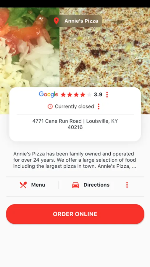 Annie's Pizza restaurant app has many different functions. It contains an online ordering link, restaurant images, address and driving directions, store hours, menus, and many other great features.