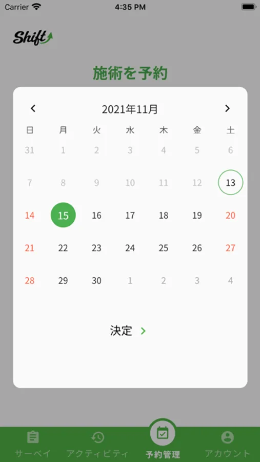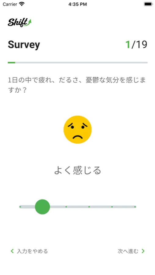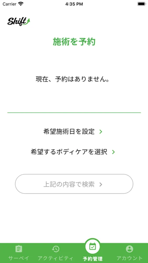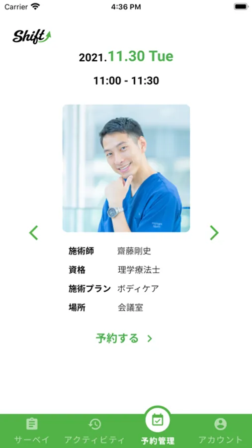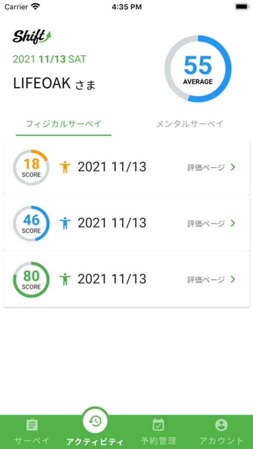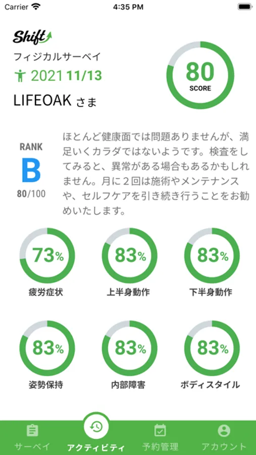 Shiftアプリで独自のサーベイを用いて『カラダ』と『ココロ』を可視化し包括的に健康状態を評価します。健康状態をカテゴリー別に評価し、『数値』と『ランク』で評価されます。施術者がサーベイの評価をもとに施術方針を提案して、施術を行います。