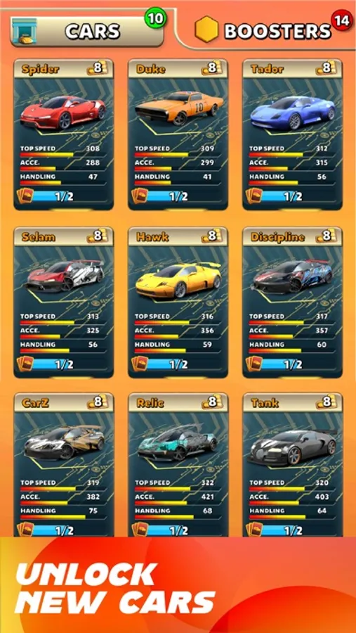 There is a long ranking list full of opponents you have to beat. Do daily missions, collect rewards and chests, buy and upgrade new cars, use boosters and beat your rivals on the rankings. Rise to the top of the rankings by winning tournaments and beating bosses, become the best racer in the world!