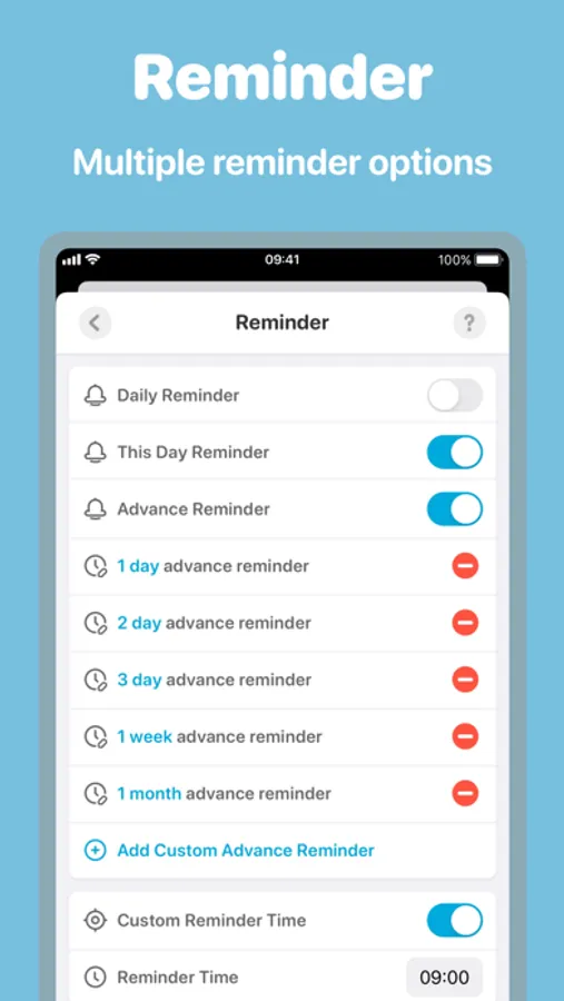 • Supports daily reminders, advanced reminders, and custom reminders.
