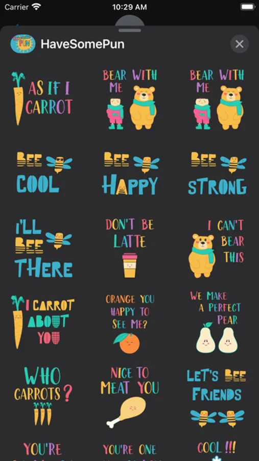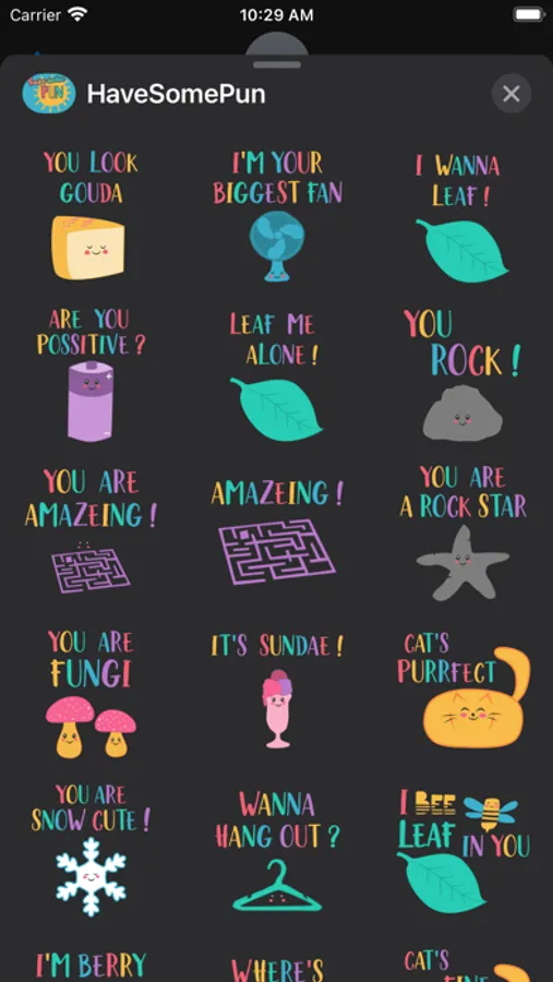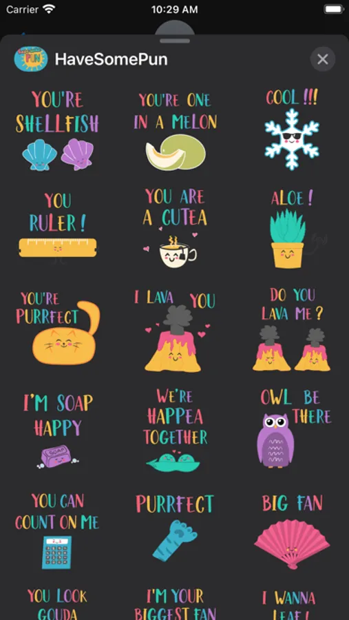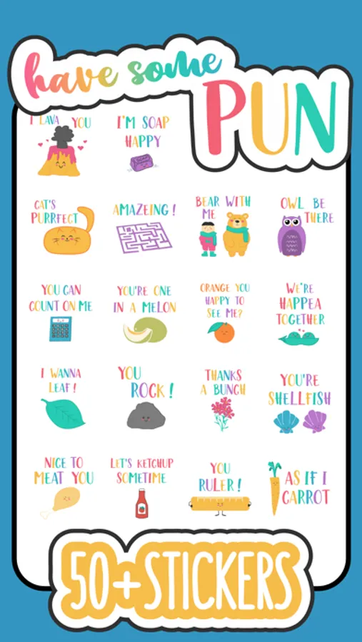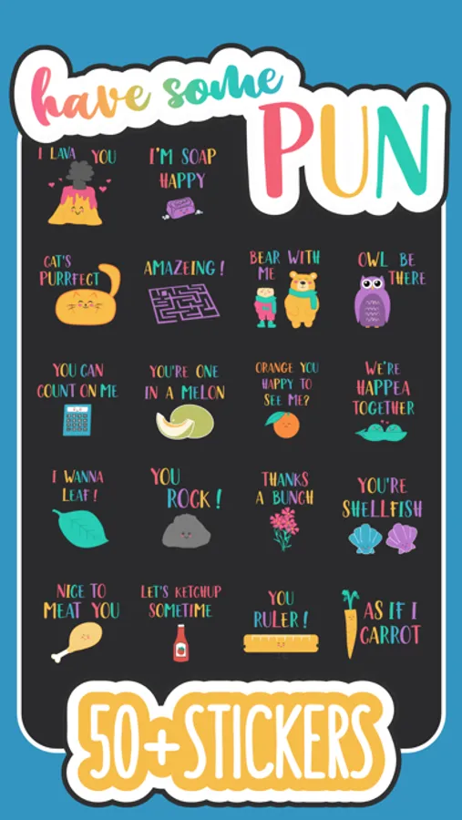 Add some fun to your conversations with these stickers. You can spice up any message by attaching one of these cute puns.