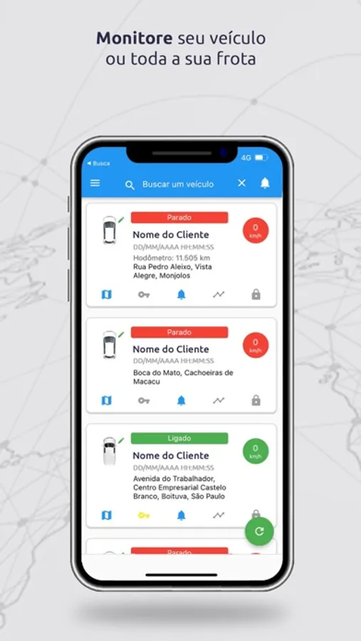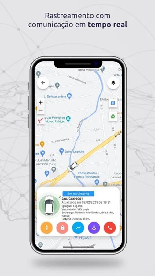 - Localização com endereço, ignição, velocidade, outros.