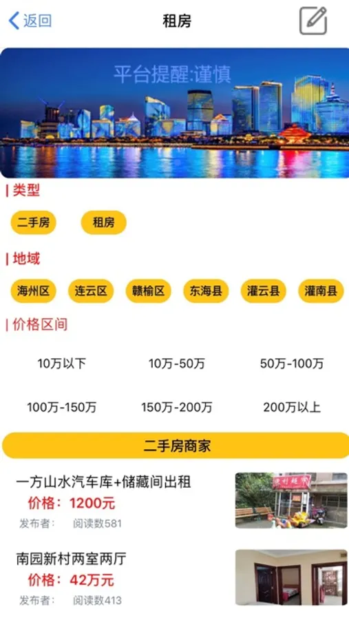 港城便民是一款连云港本地生活应用,包括房屋信息、二手车信息、闲置物品信息、生活信息等各类便民信息。用户可自行发布信息,我们有专业的后台审核人员,且我们已接入官方文本屏蔽接口