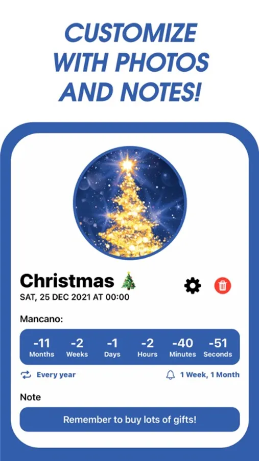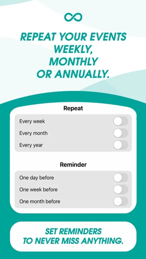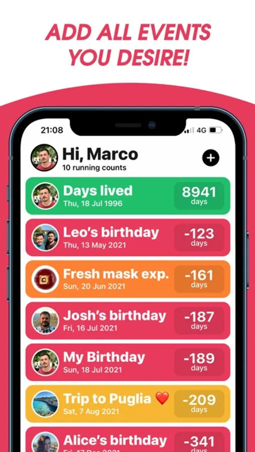 WhatCounts helps you keep track of all your important events and dates: set a daily, weekly or monthly reminder to receive early notifications and never miss a thing!