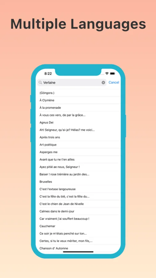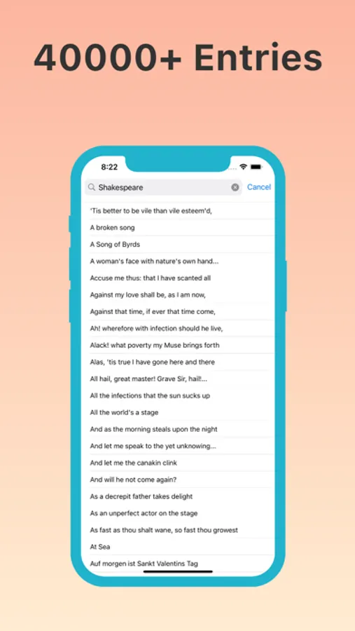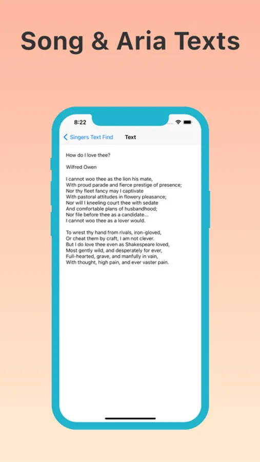 Find song and aria texts in one centralized spot! Containing over 40000 unique entries, with famous poems, lyrics, and aria texts, primarily in English, German, Italian, and French, this app lets you easily highlight, cut, copy, paste, edit, and make notes within the text body. Thematic recitals, anyone?