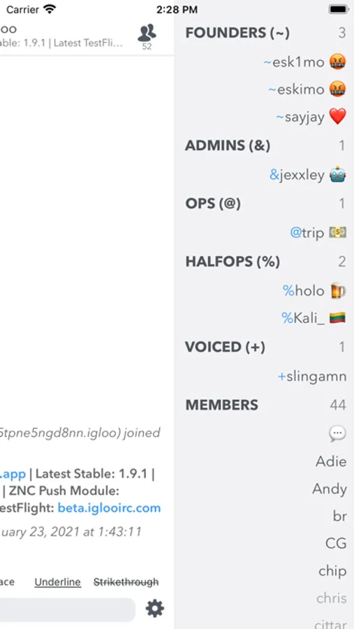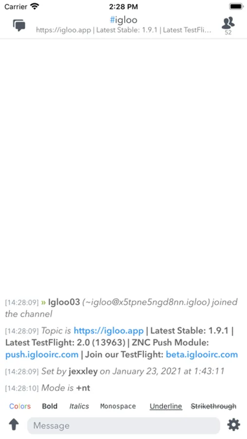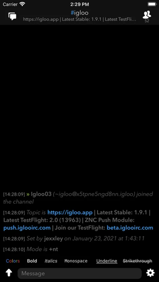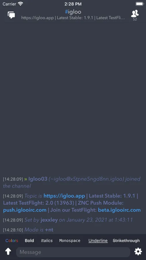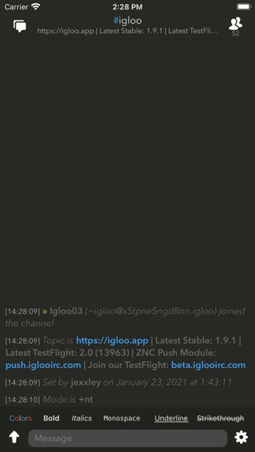 Igloo is a modern IRC client that supports lots of IRCv3 extensions and works flawlessly with all your favorite networks like Freenode, Libera, Snoonet, Rizon, EFnet, and all others. It has a very simple UI and lots of great themes to choose from. It is the only IRC client on iOS to support DCC/XDCC downloads that get synced right to iCloud Drive so you can access them on your iPhone/iPad in the Files app or on your macOS computer right in a folder called "Igloo". We've also added some extra modifications to improve your experience when using a bouncer such as ZNC, and we even support the IRCCloud bouncer.