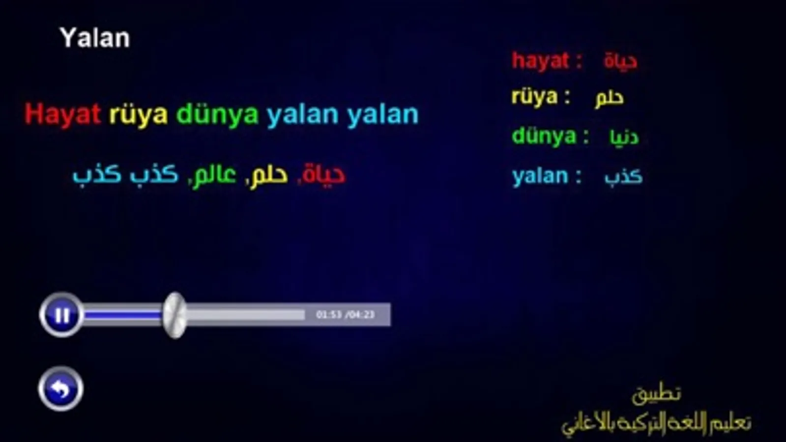 لمن يرغب بتعلم اللغة التركية اهلا بكم حيث تطبيق تعلم اللغة التركية بالاغاني حيث يوفر لكم طريقة سهله ومبتكرة لتعليم اللغة التركية بواسطه الاغاني التركية المشهورة مثل اغاني ابراهيم تاتلس واغاني سيبيل كان وغيرهم