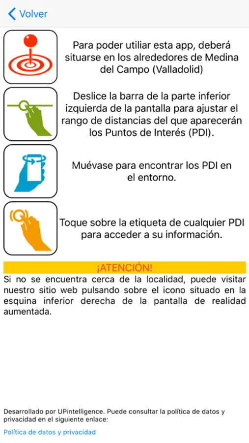Con esta aplicación puedes descubrir lugares de interés mediante realidad aumentada que se encuentran en la localidad de Medina del Campo (Valladolid): alojamientos, comercios, hostelería y puntos turísticos.
