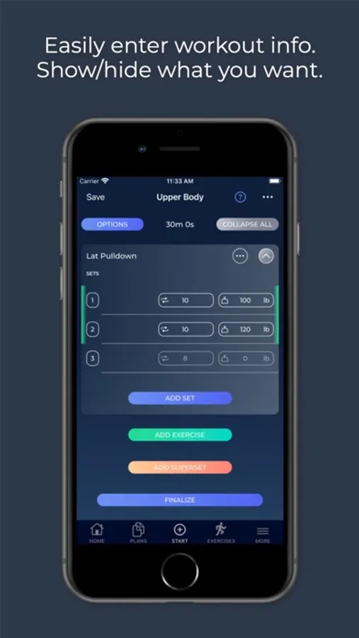 Organize your in-progress workout sessions with ease. The custom style helps you enter information quicker than most other apps.