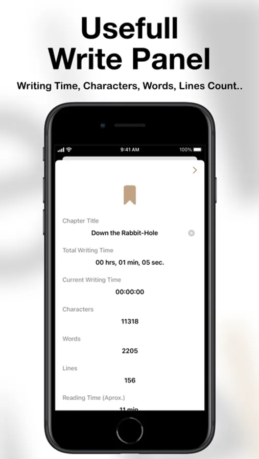 • Unlimited chapters, with character count, paragraphs, lines, words, writing time and reading time.