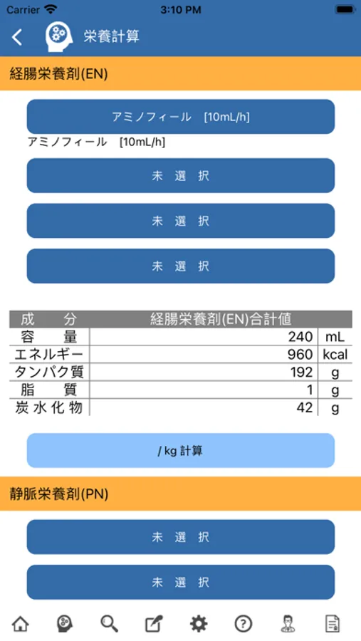 急性期栄養療法および慢性期栄養療法いずれにおいても、栄養投与量の把握は臨床実践、栄養研究に必要不可欠です。しかし栄養投与量を手計算するのはなかなかに大変です。本アプリはそれを自動計算するもので、医師や管理栄養士だけでなく全ての職種の方が手軽に栄養計算を行えるようになります。経腸栄養ENと静脈栄養PNに分けて入力しカロリーと栄養成分(タンパク質、炭水化物、脂肪の1日投与量)を計算することが可能で、同時に窒素バランスの計算や目標栄養からの逆引き計算(目標達成するのに至適な栄養製剤の検索)を行うことができます。また2018年段階での栄養製剤年鑑に登録されている全ての栄養剤登録されており自施設で使用している製剤のみ選択して候補とすることができ、また新規あるいはオリジナルの栄養製剤を追加登録することも可能です。このアプリは日本の臨床栄養と栄養研究の推進のために皆様に無料でお使いいただけるよう日立総合病院の中村謙介が開発いたしました。是非ともお使いください!!