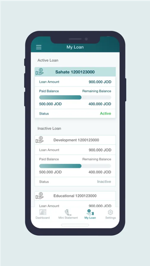كشف حساب مصغر لكافة القروض الفعّالة والمنتهية.