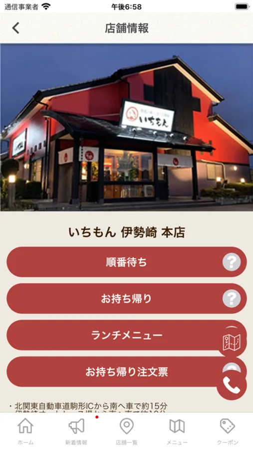 (アプリのクーポンページの上部に利用店舗がかかれています。タップすると利用可能店舗一覧が出ます。お出かけ予定のいちもん店舗を確認して、会計時にスタッフへお見せください。)