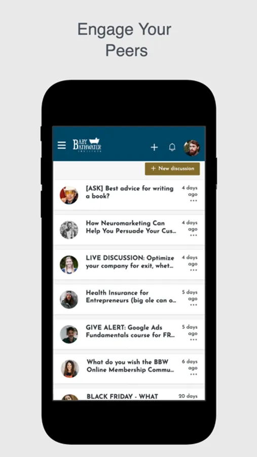 This is the private app for the Baby Bathwater Institute membership community. Members can shoot the breeze in the live feed, engage in high-level business discussions in the forum, explore a treasure trove of resources, connect with other members who have similar interests, and enjoy many more exclusive perks. Baby Bathwater is an entrepreneurial support system of Events, Resources, & Community where you receive tangible business value and your relationships deepen.