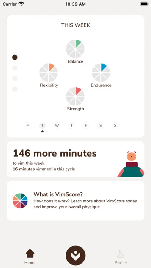 VimScore motivates you to start training and staying active by offering customized workout programs that are based on your physical health and available time. The workout programs are based on research to promote general health, where the foundation is in the areas of strength, endurance, balance and flexibility.
