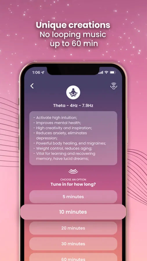 * Choose the song and apply the Binaural Beats (Epsilon, Delta, Theta, Alpha, Beta, Gamma, Lambda or without frequency). Available in 5, 10, 20, 30 or 60min.