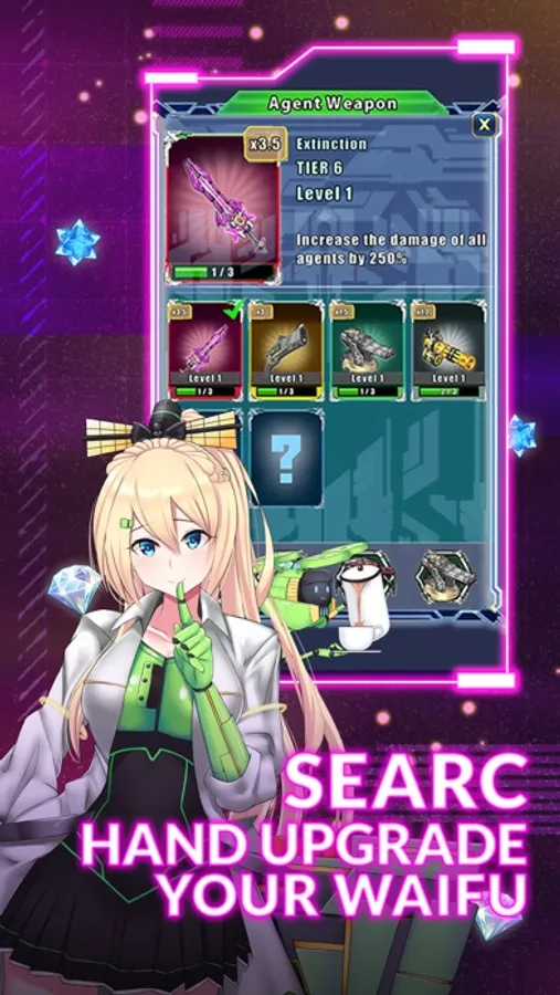 Have you ever wondered what it's like to manage a space farm? Protect your farm from monsters and earn idle profit to build your station. Become a space farmer and manage space agents (waifus) in this tycoon game! Collect all waifus and defeat enough monsters to strengthen your space empire!