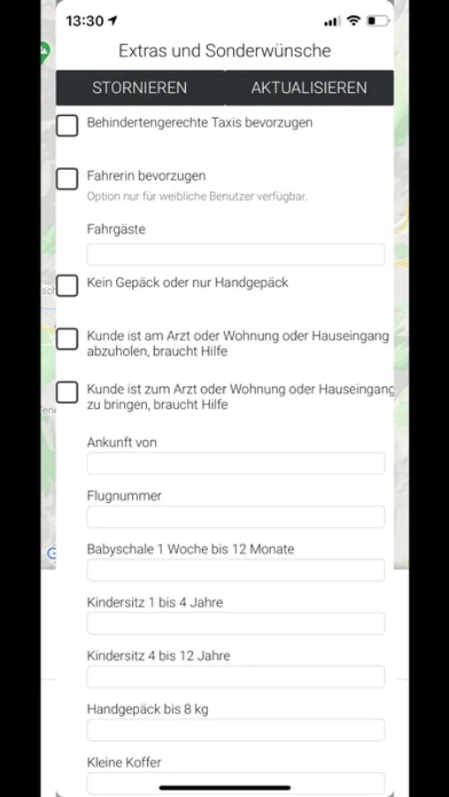 - Sie können Ihre Einstellungen bei jeder Taxi Bestellung festlegen, z. B. Anzahl der Passagiere, Gepäck, Flugnummer und vieles mehr.