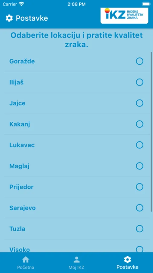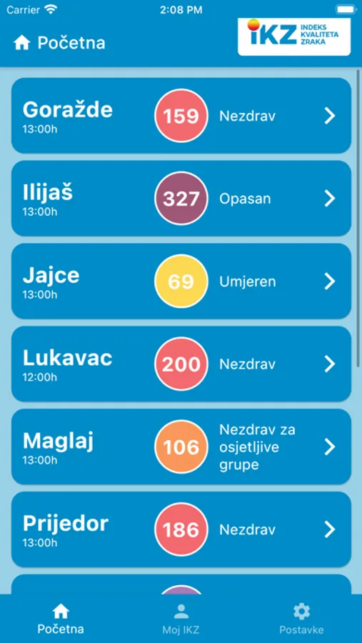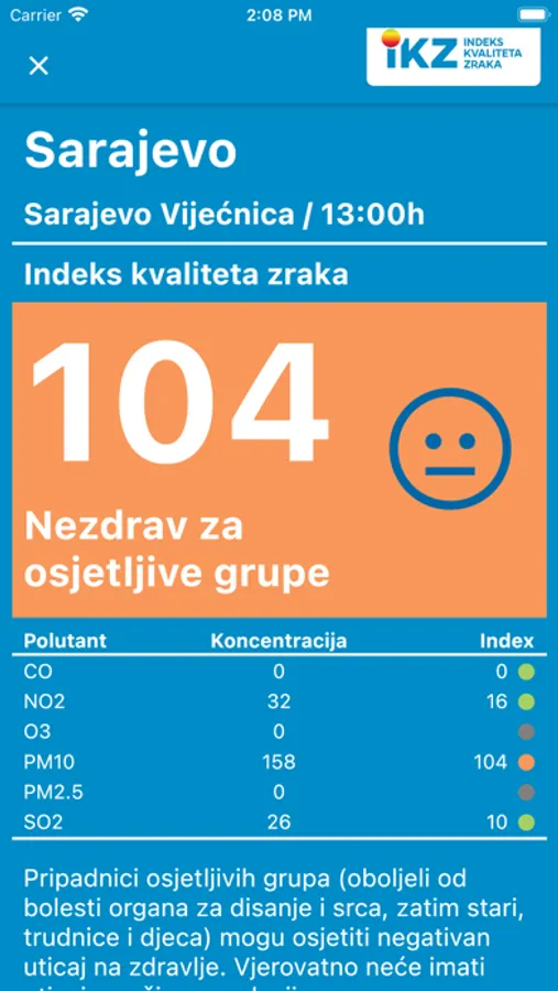 Uz ovu aplikaciju možete pratiti trenutno stanje kvaliteta zraka u gradovima BiH u kojima postoje automatske stanice za mjerenje zagađujućih materija zraka.