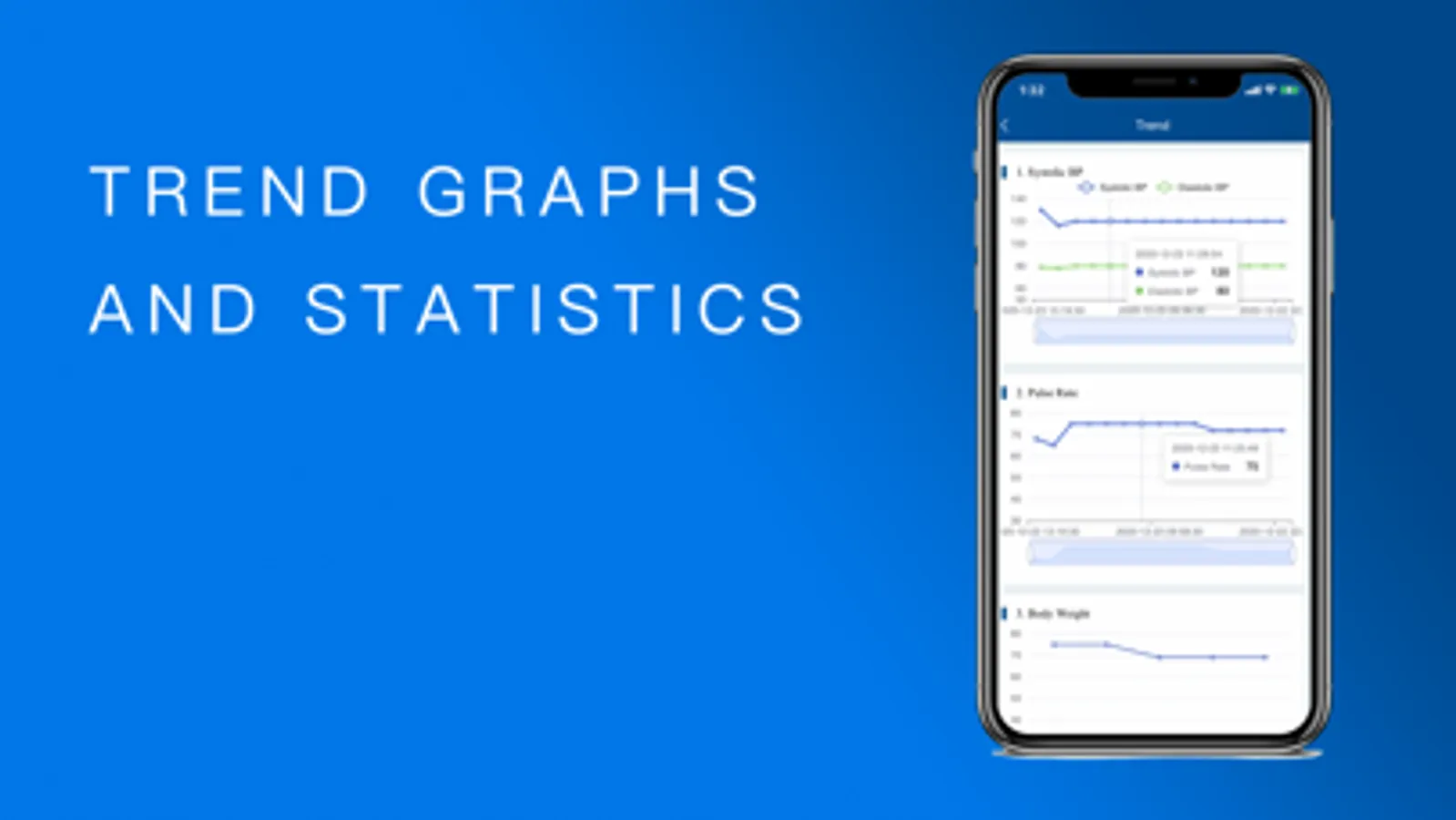 - Analyse the systolic, diastolic blood pressure, pulse rate trend, graphs and statistics.