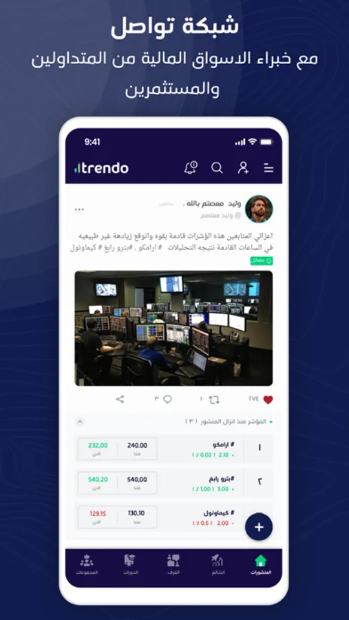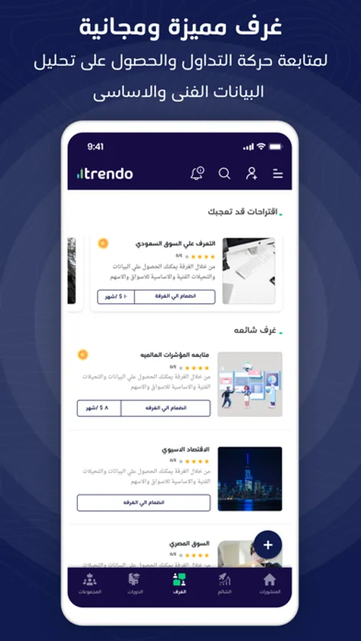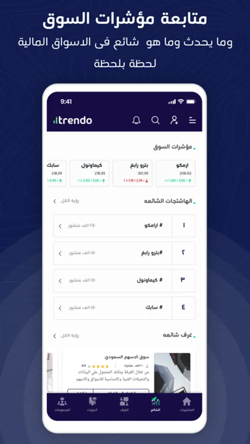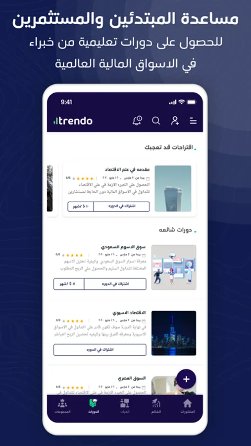 يقوم تطبيق تريندو بمساعدة المبتدئين والمستثمرين حجز دورات تعليمية ف الاسواق العالمية وايضا يمكنهم من متابعة حركة التداول والحصول علي تحليل البيانات ومتابعة مؤشرات السوق وما هو شائع لحظة بلحظة