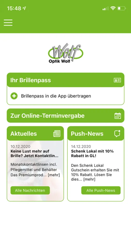 Mit der Optik Wolf App haben Sie stets alle News zu Ihrem Optiker Wolf griffbereit. Außerdem können Sie Ihre Optik Wolf-Card in die App laden und so das Guthaben und den Punktestand bequem abfragen. Über die Online-Terminvergabe finden Sie schnell Ihren passenden Termin.