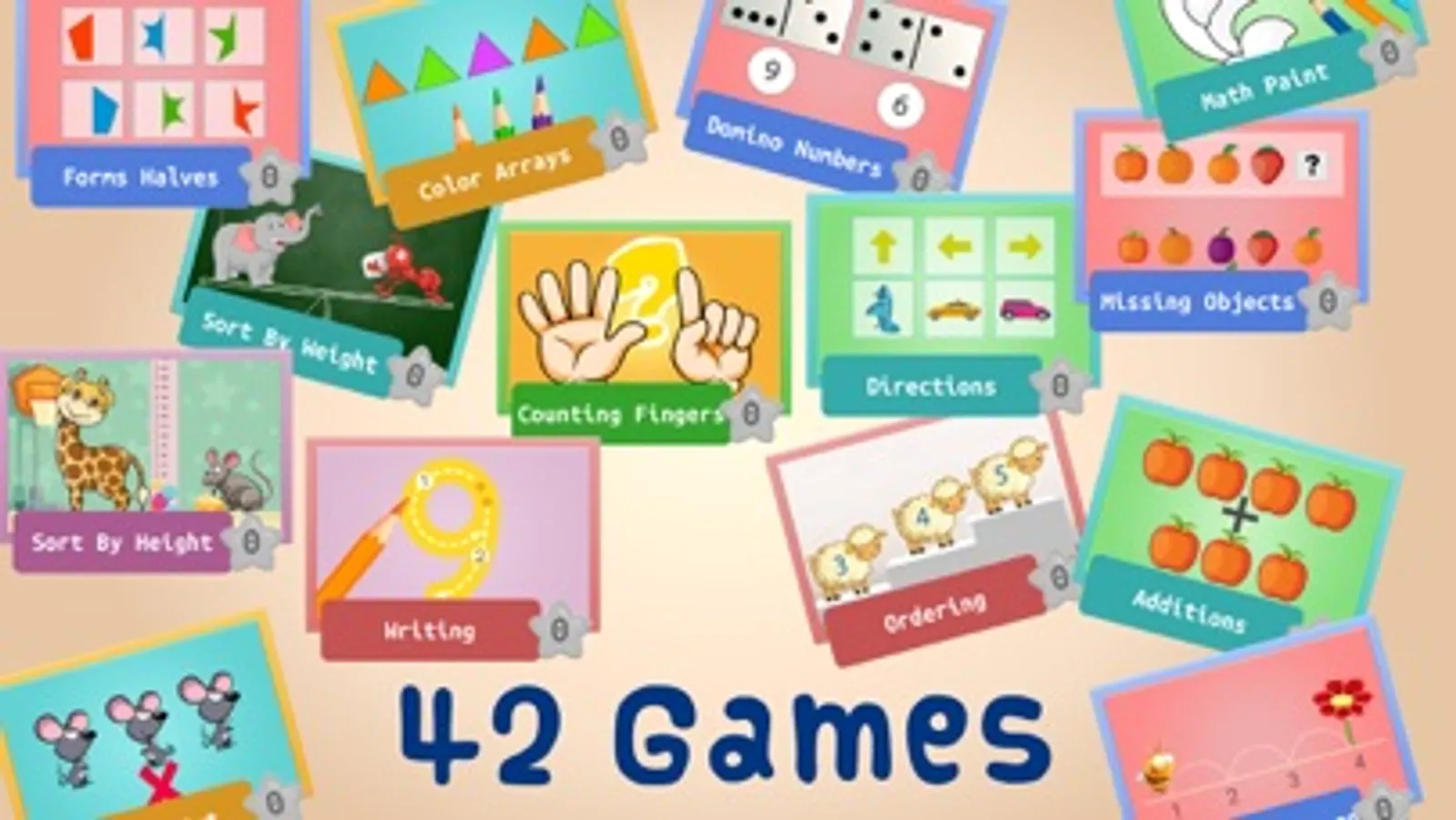 Contains 42 fundamental math activities like counting, sorting by size, sorting by form, writing numbers, addition, subtraction and more.