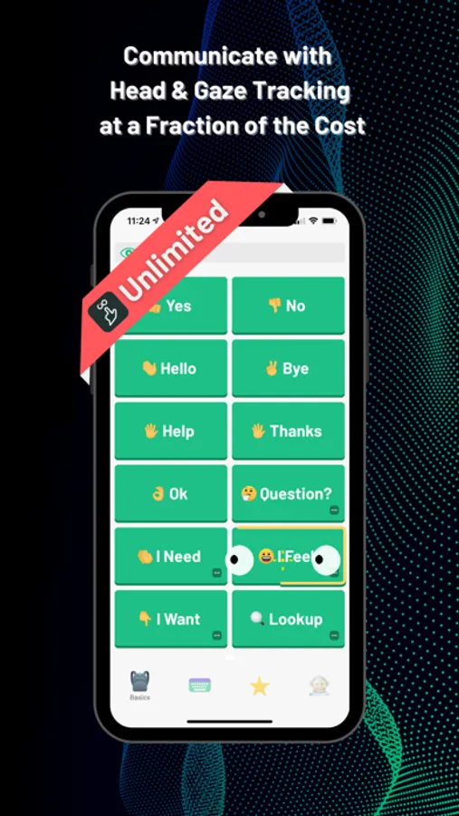 Everything the app can do is accessible using gaze and head tracking, switch, touch, or swipe. The Apple TrueDepth camera and our patented eye-tracking technology allow you to speak using eye, head, and nose movements and make selections with your blink, your smile, or dwell- and unlike some expensive eye-tracking systems, it works beautifully outdoors in bright sunlight.