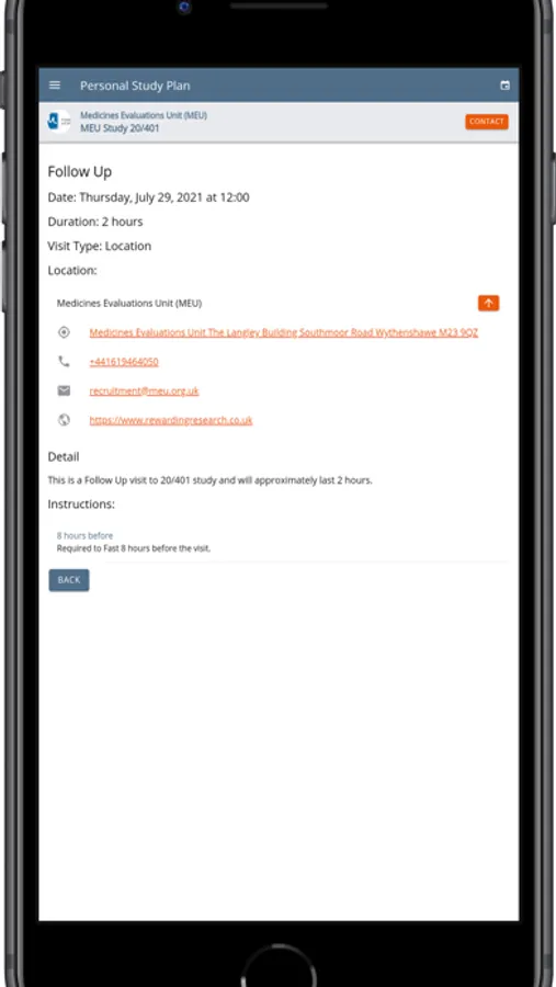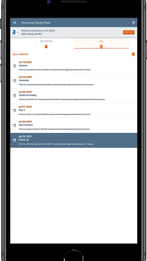Personal Study Plan - your personalised schedule of all trial visits, set up by your trial organisation. Mi-Trial allows these to be configured with specific instructions, which have associated reminders which can be delivered both in-app and via push notification (if enabled). You can sync your Personal Study Plan with popular calendars such as Google, Microsoft or Apple Calendars.