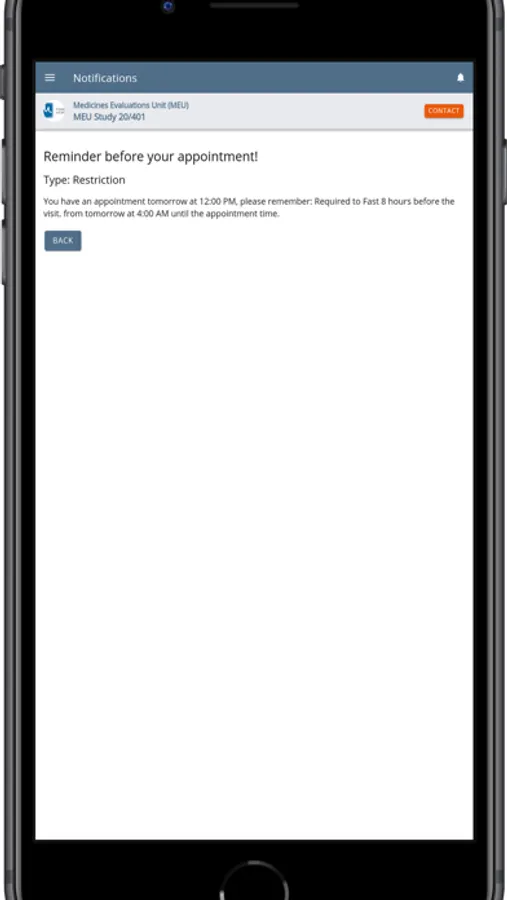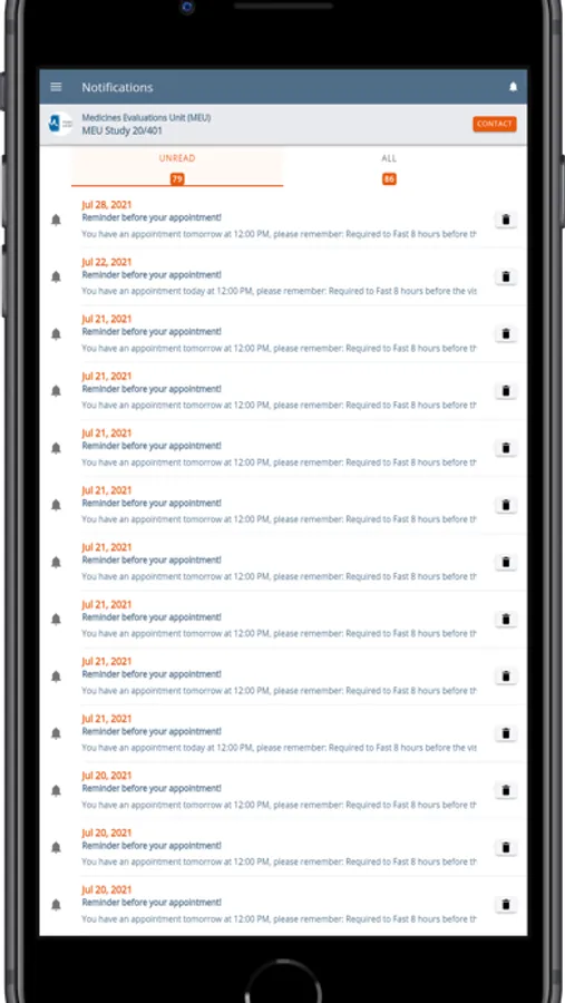 Notifications - in-app feature for users who do not wish, or are unable, to receive push-notifications. The Notifications feature in the app is a record of all (and, separately, Unread) notifications. These include: new appointments, appointment changes, instructions and timed reminders. For example, fasting 8 hours before an appointment.