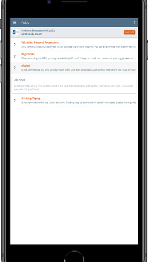FAQs - Frequently Asked Questions, as configured by your trial organisation. These may be general FAQs such as smoking or COVID policies, or more bespoke and relating to your particular study.
