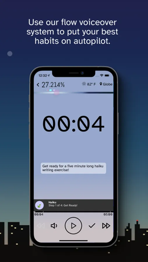 Imagine receiving specific step by step instructions, read out to you by your phone on what to do and when. For everything from a workout, to brushing your teeth, to meditation, still life drawing, or a morning routine, our flow system offers your moment to moment of instructions on what to do. Now you don't have to focus on the what, or the when, and you can concentrate on doing. Put your good habits on autopilot!