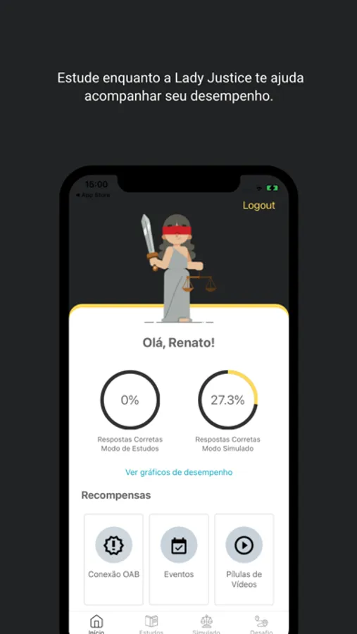 Além disso, você terá acesso aos gráficos de desempenho que serão analisados pela Lady Justice, uma personagem que criamos para ser a sua mentora nesta jornada. Ela vai te dar dicas para melhorar diariamente o seu desempenho, otimizando o seu tempo e garantindo seu sucesso na prova.