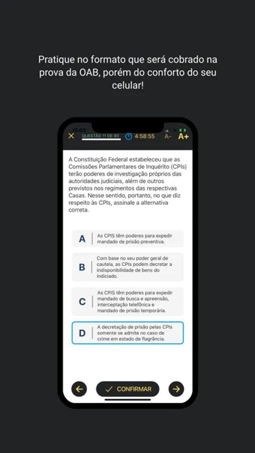 No Modo Simulado você poderá controlar o tempo se preparando para as 05 horas de prova, e cada disciplina é contemplada de acordo com os percentuais que apareceram nas edições dos últimos anos.