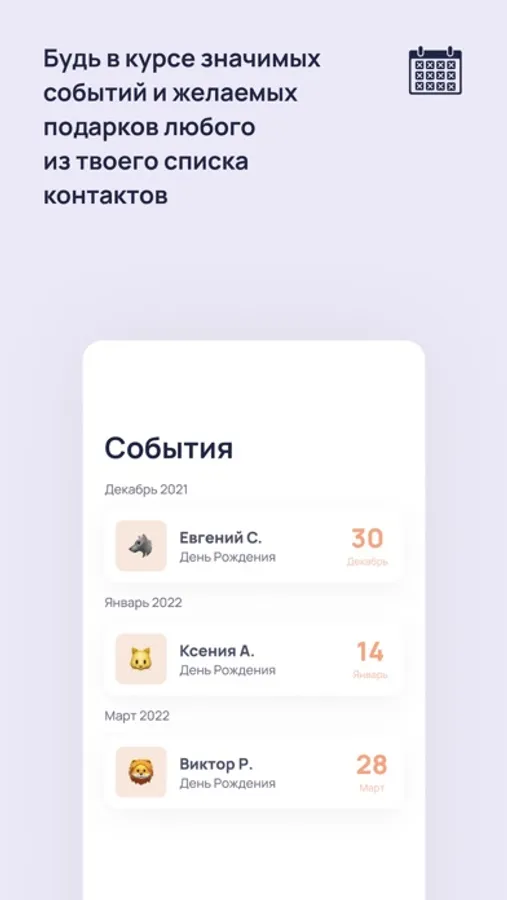 Смотрите пожелания по подаркам у ваших друзей и ближайшие праздники из своего списка контактов.