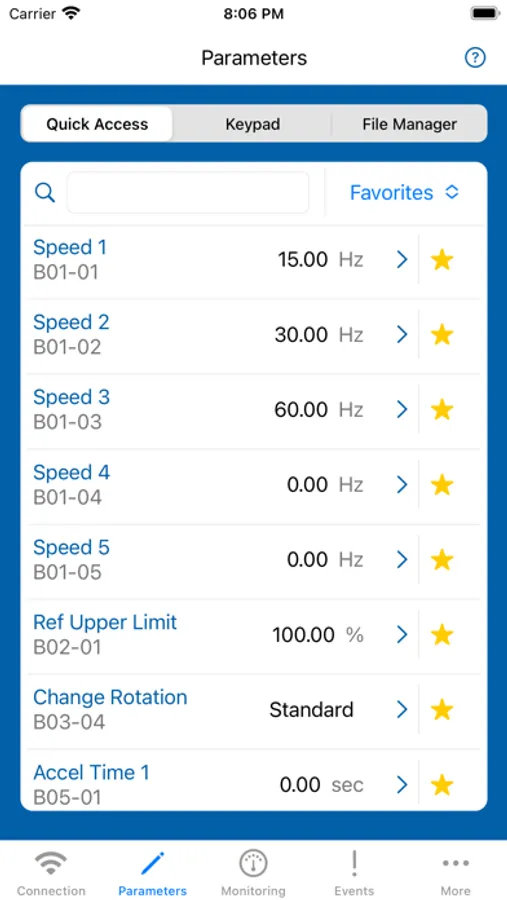 - Event History: Comprehensive data logs during fault, alarm, and run events. This includes 400 alarms, 400 faults, and 5000 runs. Will rollover. (Event History files are compatible with Impulse Link 5)