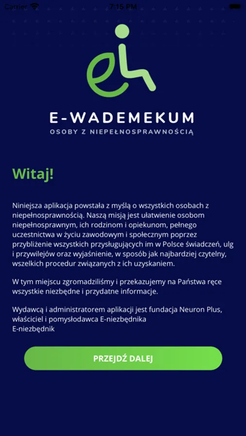 Fundacja Neuron+ oraz działający na jej zlecenie doradcy i konsultanci dokładają wszelkich starań w celu zapewnienia możliwie największej dokładności i aktualności informacji zawartych w aplikacji E-Wademekum. Fundacja Neuron+ informuje jednak, że zarówna aplikacja jak i przedstawione w niej treści, stanowią jedynie wskazówki i sugestie, które mogą być pomocne przy uzyskaniu informacji na temat świadczeń dla osób z niepełnosprawnościami. Ostateczną decyzję o uzyskaniu świadczenia podejmują organy uprawnione do tej czynności w oparciu o aktualną wiedzę i przepisy, oraz konkretną sytuację. Fundacja Neuron+ przypomina, że w szczególnych sytuacjach klinicznych, wskazówki zawarte w aplikacji E-Wademekum – mogą nie stanowić jedynie źródło informacji.